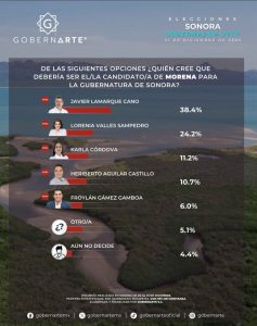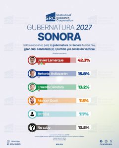En ese mismo ejercicio de SRC, el alcalde de Cajeme aparece con la mayor intención de voto en un escenario donde sería candidato de Morena a la gubernatura, con 42.3 por ciento de las preferencias, frente a 15.8 por ciento del alcalde de Hermosillo, Antonio Astiazarán.